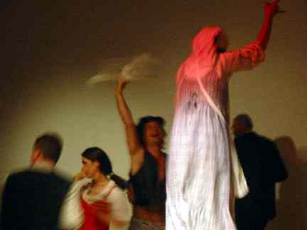 Die erste Nachtreise der Freien Theater Bielefeld am Samstag Abend war ein voller Erfolg. Schon Wochen vorher ausverkauft, kamen die insgesamt 140 MitläuferInnen voll auf ihre Kosten. Die Idee war so schlicht wie genial: Man spiele an vier Orten in Bielefeld Theater und unterhalte das verehrte Publikum unterwegs aufs theatralischste. Los gings für die eine Hälfte des Publikums (»Tour B«) im Forum für Kreativität und Kommunikation in der Marktstraße, die andere Hälfte (»Tour A«) startete beim Alarm-Theater in der Gustav-Adolf-Straße. Für die 75 Reisenden der Tour B zeigte die Gruppe »Götterspeise« Ausschnitte aus ihrer Produktion »Wieder unterwegs Don Quijote«. Ein beständiger Wechsel zwischen an die Wand gestrahlten Filmsequenzen und real gespielter Handlung auf der Bühne. Christine Ruis führte das Publikum dann ins Theaterlabor, wo die Performance »Plastik Play« den ZuschauerInnen plastisch vors und ins Auge geführt wurde. Wer sich fragte, was mensch bekleidungstechnisch mit Plastik machen kann und ob philosophieren und lamentieren in einer gelben Mülltonne möglich ist, erhielt praktische Handreichungen durch die SchauspielerInnen des Theaterlabors.