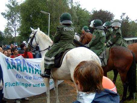 Auch Sergej würde keinesfalls in seine Heimat zurückgehen. »Ich würde sofort ins Gefängnis gesteckt und dort würden sie mich umbringen«, fürchtet er. Die Demonstration findet er gut. »Es ist angenehm zu merken, dass sich jemand für uns interessiert«, freut er sich über die Demonstranten. Als die an dem Gelände eintreffen, droht die Situation für einen kurzen Moment zu eskalieren, als einige sich am Zaun zu schaffen machen. Ihr als Sprechchor formuliertes Vorhaben, »Bewegungsfreiheit auf allen Wegen, wir werden jetzt den Zaun zerlegen«, wird jedoch von berittener Polizei und Beamten mit Helm und Schlagstock vereitelt. Nach einer Kundgebung machen sich die Demonstranten auf den Weg zum Bahnhof oder ins Camp in der Nähe der Landesaufnahmestelle.