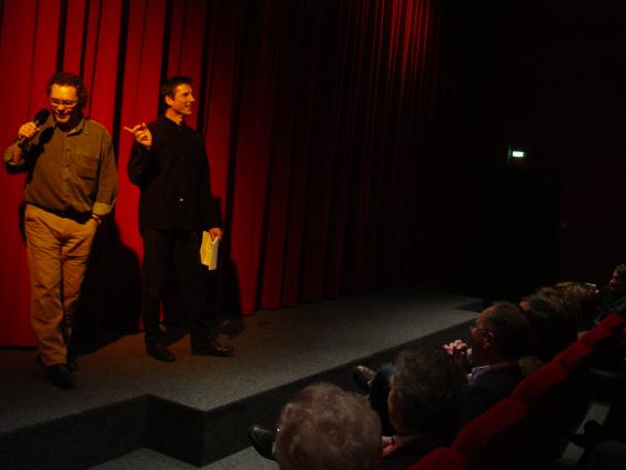 Gesellschafter Ronald Herzog und Geschäftsführer Jürgen Hillmer bereiten ihren Auftritt zur Eröffnung vor in der hintersten Ecke des Kinos vor...