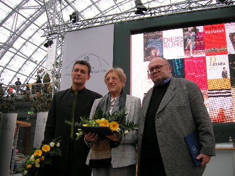 V.l.n.r.: Ilija Trojanow (Belletristik: »Der Weltensammler«), Ragni Maria Gschwend (Übersetzung: »Aufbrüche« von Antonio Moresco), Franz Schuh (Sachbuch/Essayistik: »Schwere Vorwürfe, schmutzige Wäsche«)